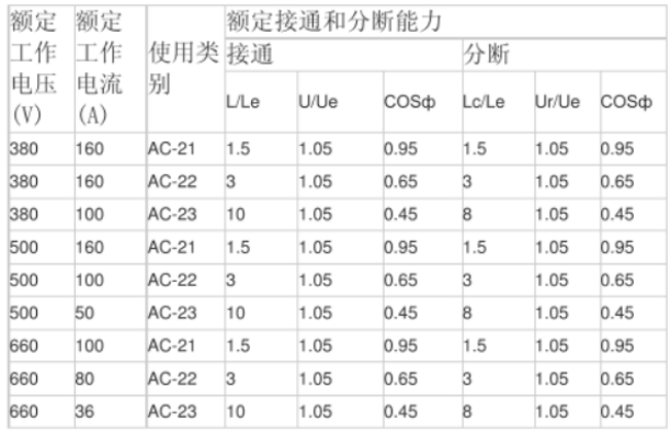 表15.2開關在不同工作電壓、不同使用類別下的工作電流