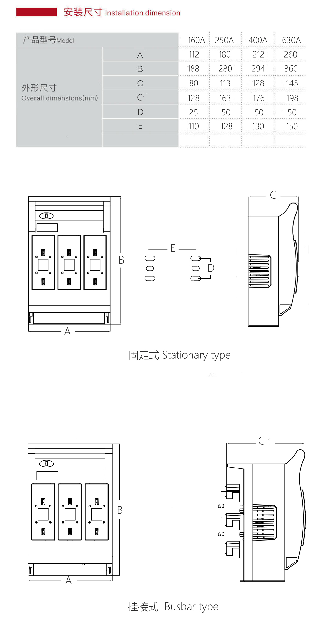約定發熱電流lth 40A 63A 160A 250A 400A 630A 額定絕緣電壓Ui 690V 800V 額定工作電壓Ue AC380\660 額定頻率Hz 50Hz 額定接通能力(A.r.m.s) 10le 額定分段能力(A.r.m.s) 8le 額定限制短路電流(r.m.s) 50kA 額定工作電流le 400V/AV-23B 40A 63A 160A 250A 400A 630A 400V/AV-23B 32A 50A 100A 200A 315A 425A 機械壽命(次) 10000 8000 5000 3000 2000 1500 電壽命(次) 3000 2000 1000 600 400 300 操作力F ≤100 ≤150 ≤250 ≤300 ≤350 ≤400 熔斷器損耗功率P 4W 6W 12W 24W 34W 48W 重量(三級開關)Kg 0.36 0.65 1.2 3.5 5.1 6.85 輔助微動開關主參數 50Hz、AC-15、220V、3A - 安裝尺寸